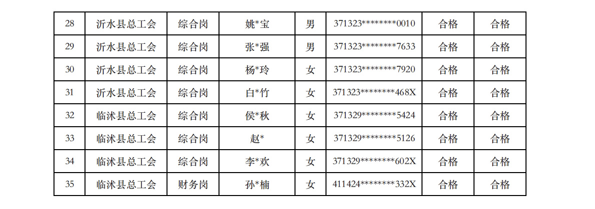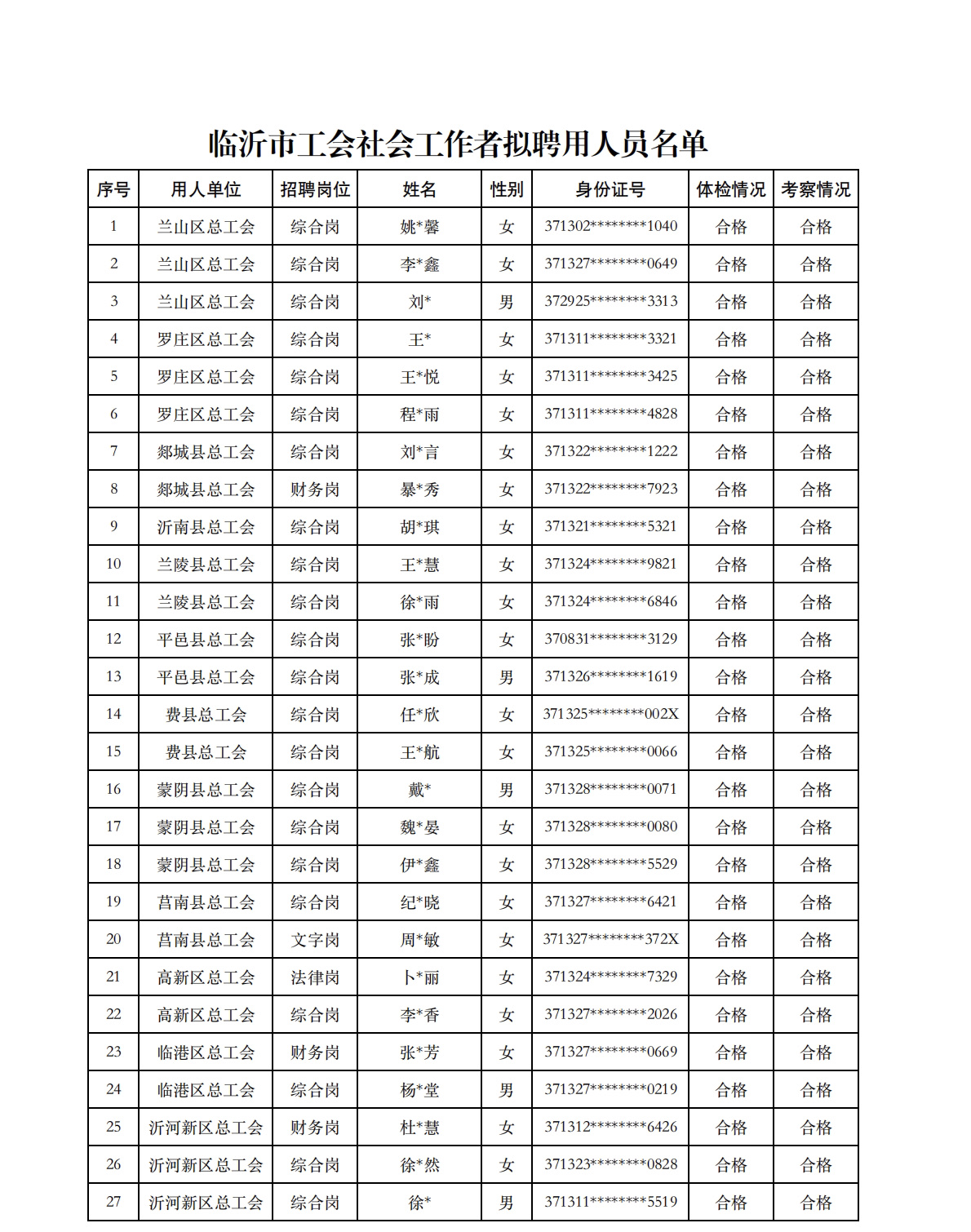 根据《临沂市工会社会工作者招聘公告》要求,经过报名、资格审查、笔试、面试、体检、政审、考察等程序,现对拟聘用临沂市工会社会工作者进行公示。公示期间无反映或反映问题经查不属实的,将按规定办理聘用手续。
